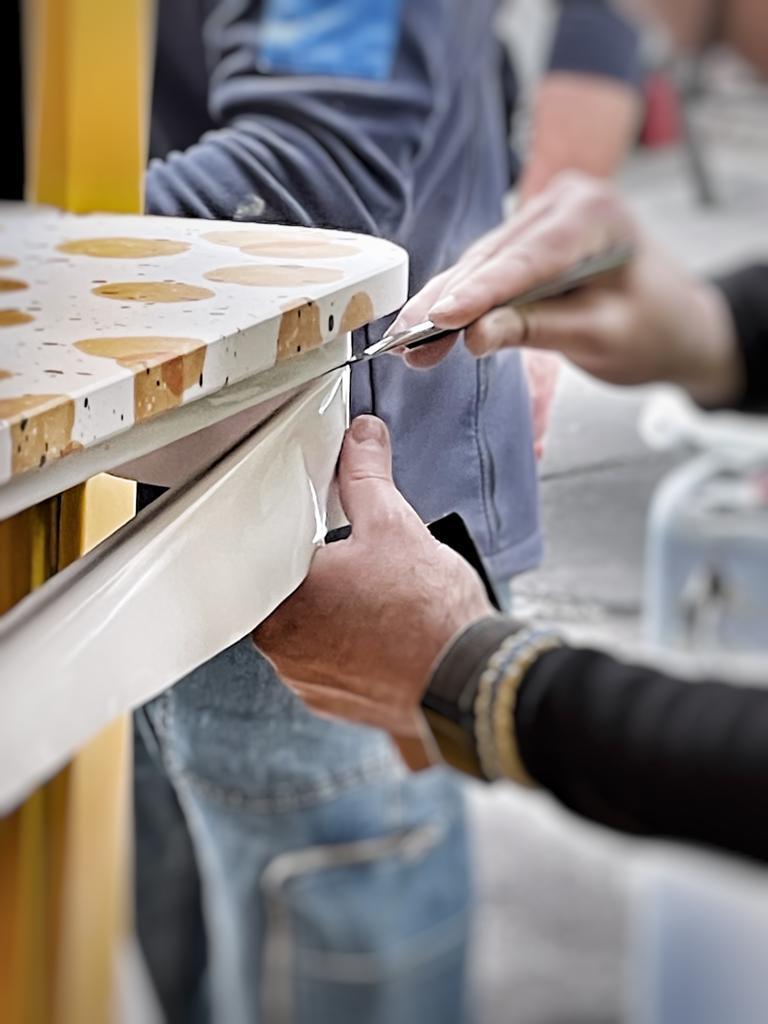 Essendo un progetto temporaneo, la scelta dell’utilizzo di pellicola adesiva per il 90% delle superfici è stato fondamentale, verniciando solamente alcune zone.