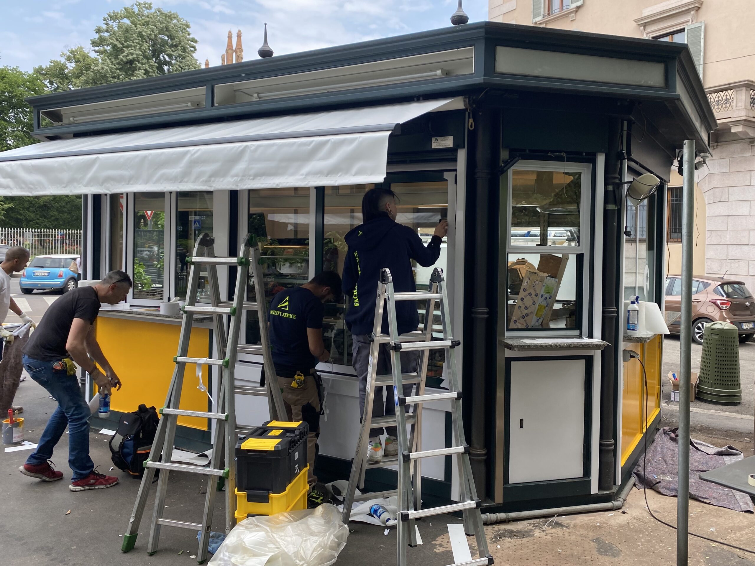 A fine evento il chiosco è stato ripristinato riportandolo allo stato originale, rimuovendo le pellicole applicate, riverniciando le zone tinteggiate e riapplicando le grafiche come in origine.