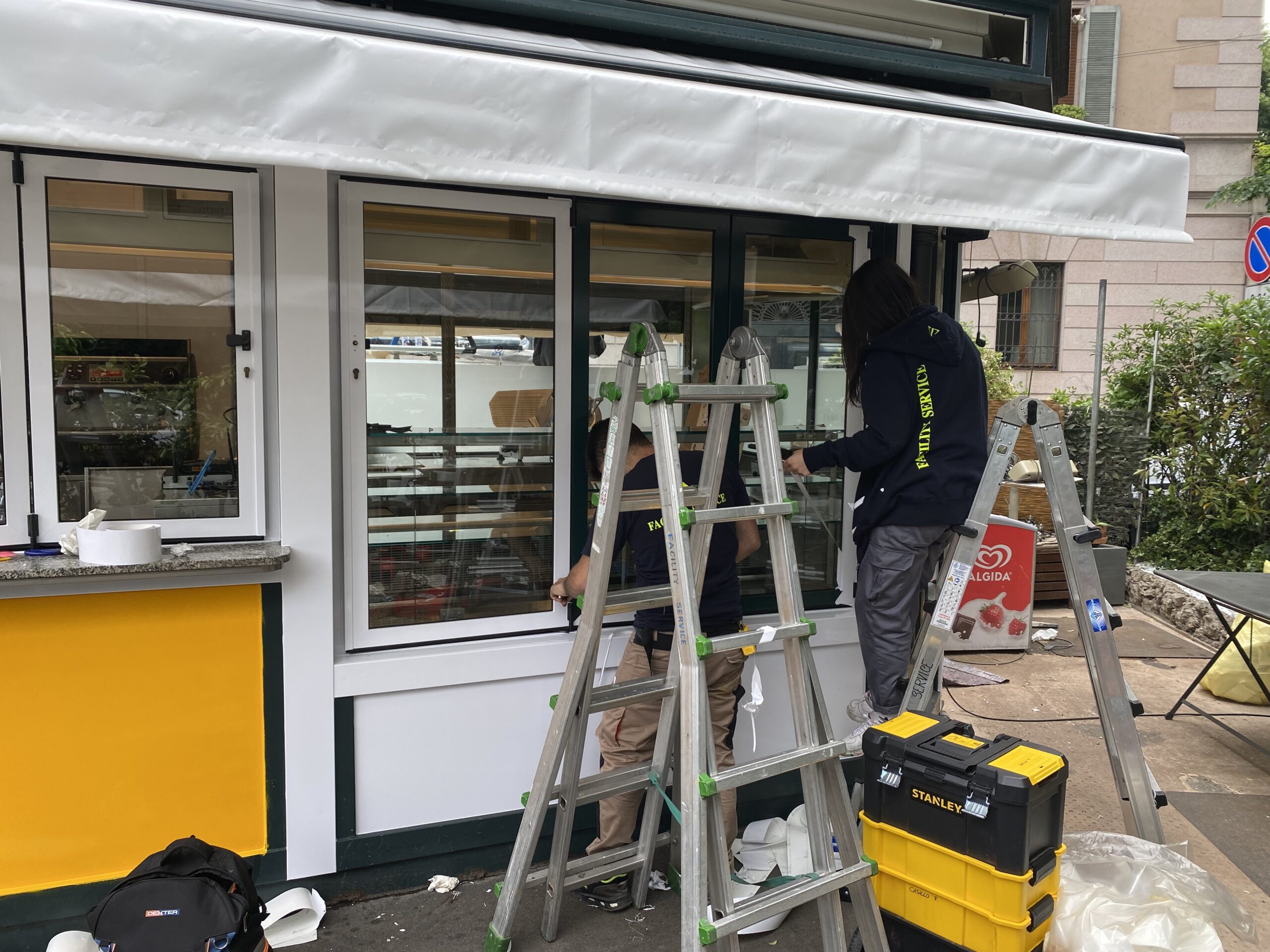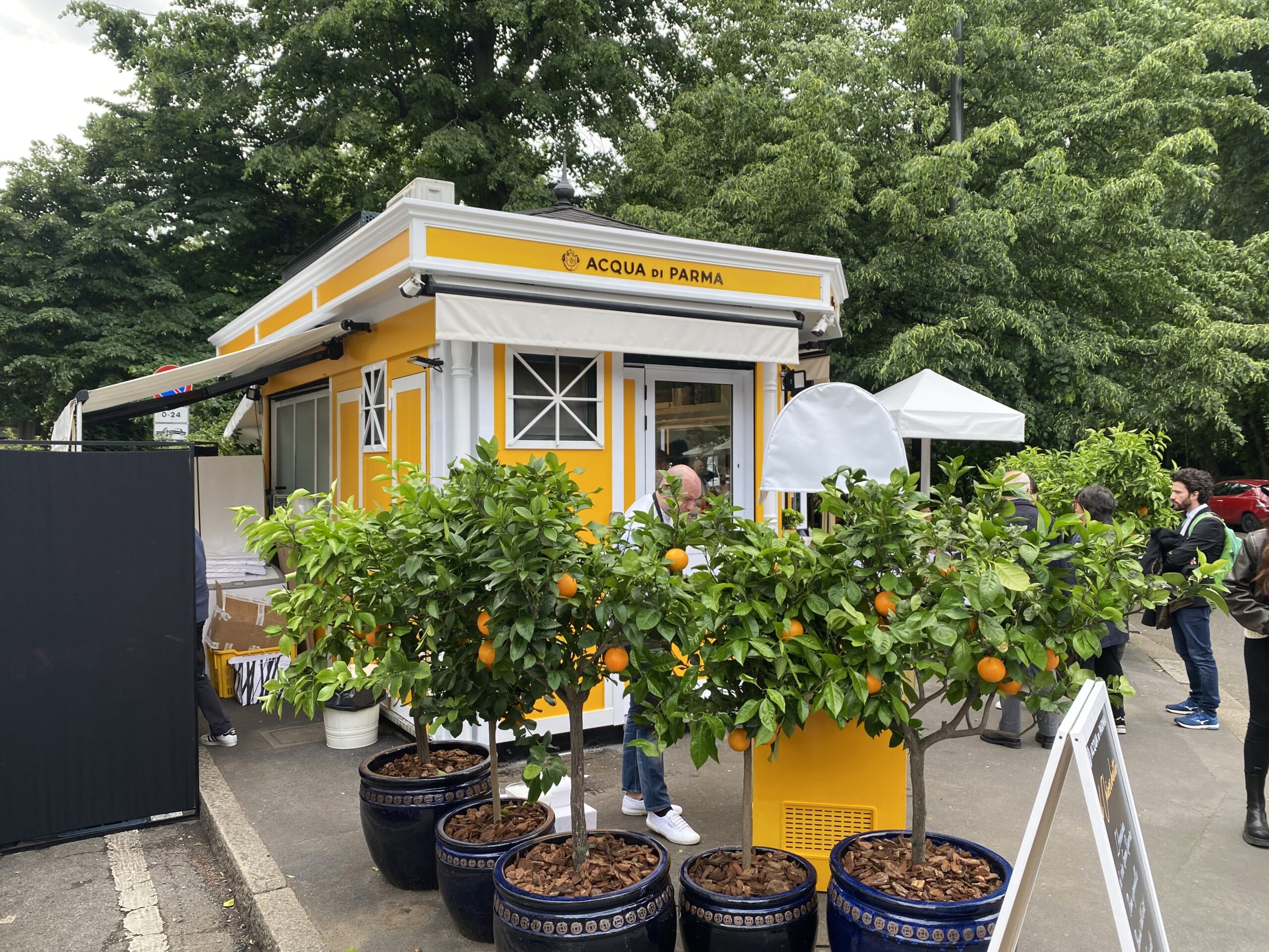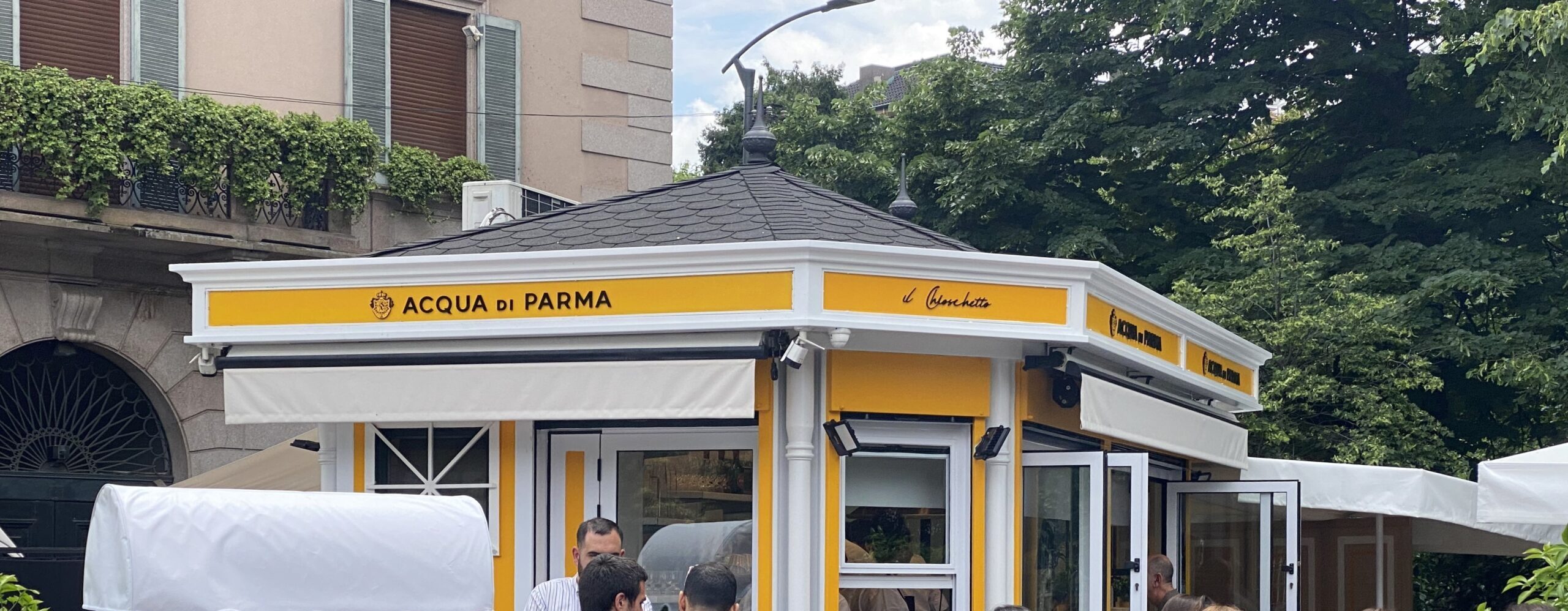 Un intervento di “vestizione totale“ con pellicole adesive di colore Giallo e Bianco, identificative del Brand, che in due giorni ha dato vita a “Il Chioschetto di Acqua di Parma“.